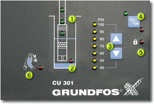 Также возможен контроль уровня воды в скважине с помощью погружного зонда (заказывается отдельной опцией) с индикацией измеряемой величины и остановкой электродвигателя насоса при опасном снижении уровня воды.